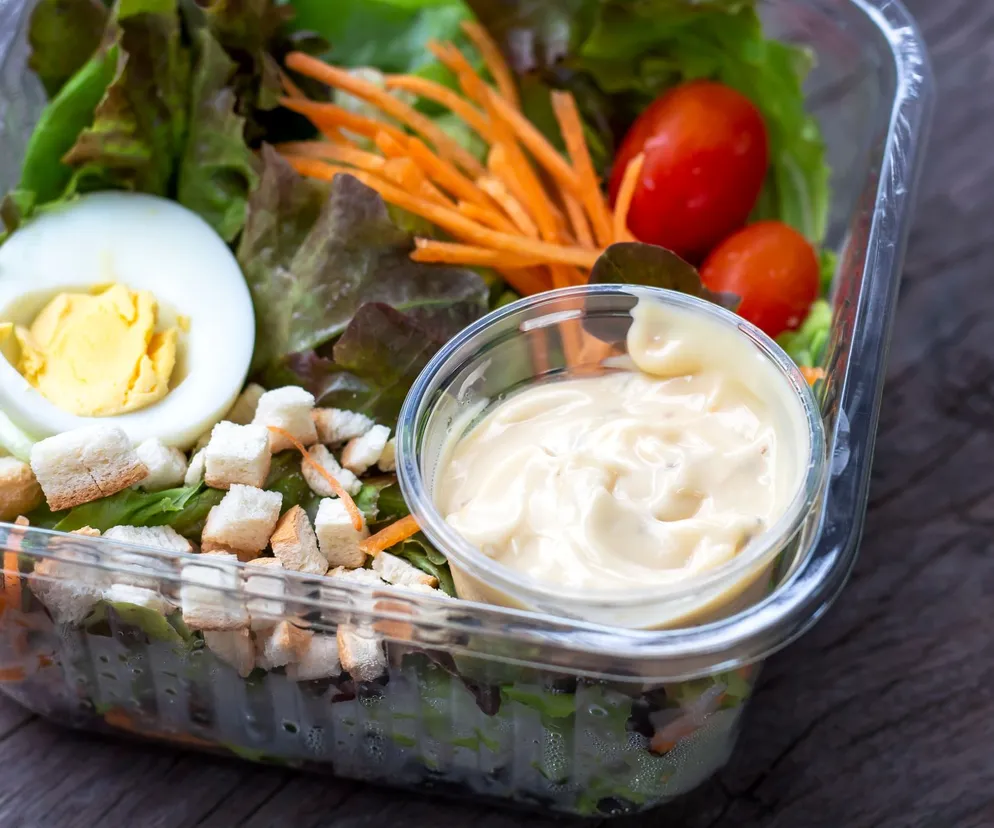 Jeśli jednak chcesz, aby listki nie zwiędły, spakuj sałatkę odwrotnie. Cięższe kąski wrzuć na dno pojemnika na lunch, a dopiero na nich połóż delikatniejsze składniki. Dzięki temu nie przygnieciesz sałaty, a na jej jędrność nie będą też negatywnie wpływać ewentualne soki z pozostałych składników. Upewnij się, że trzymasz pojemnik w pozycji pionowej podczas transportu, a kiedy nadejdzie pora obiadowa, wrzuć zawartość do dużej miski. Polej sosem i gotowe.