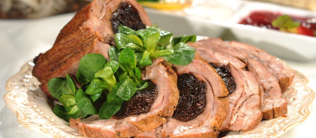 Schab nadziewaj mieszanką śliwek. Same słodkie kalifornijskie nie dadzą tyle aromatu, co polskie wędzone, bez pestek. Zanim zaczniesz je wciskać w zakamarki mięsa, wymieszaj je z wyciśniętym ząbkiem czosnku, młotkowanym pieprzem, otartą skórka z pomarańczy i 2 łyżkami rozpuszczonego masła. Można dorzucić 1 łyżkę drobno posiekanej cebuli i natki. Nie zaszkodzi garść orzechów włoskich przesiekanych nożem.
