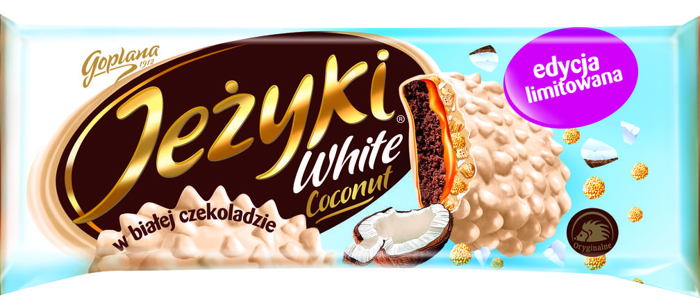 Jeżyki to uwielbiane przez konsumentów ciastka, zaskakujące bogactwem struktur i smaków. W tym sezonie na rynku debiutują w nowej odsłonie black&white z nutą egzotyki - Jeżyki White Coconut. Ciemne, kruche herbatniki oblane aksamitną białą czekoladą Goplana skrywają kuszący karmel, a także kawałki pysznego kokosa i chrupki ryżowe. Dostarczają słodkiej przyjemności w każdych okolicznościach.